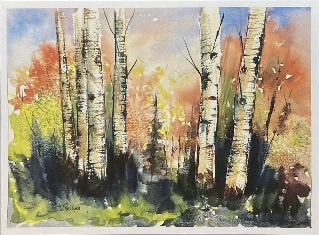 Students will experiment using techniques with tape, salt and ink where ever an accent or special effect is needed. Time permitting, the instructor will show the tape and credit card technique for birch trees.