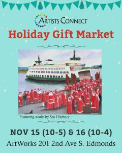 Edmonds, WA, November 2025 ─ Celebrating the excitement of live local art, the Edmonds-based Artists-Connect group is holding its annual Holiday Market gift/art show and sale on Saturday and Sunday, November 15 and 16. The Holiday Market runs from 10am to 5pm Saturday and 10am to 4pm Sunday at the Artworks building at 201 Dayton Street in downtown Edmonds, WA. Located two blocks from the Edmonds ferry terminal, the free show is a great destination event this November and parking is free.
