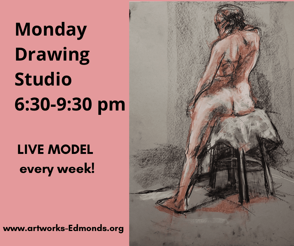 Every Monday at 6:30 pm we provide a live model for you to draw. Our Studio Coordinator will time the poses and instruct the model so all you have to do is draw! Bring your favorite drawing materials and tools and get in some quality drawing time. Drop in or pay ahead: it’s up to you. We have easels, drawing horses, and more for you to use.