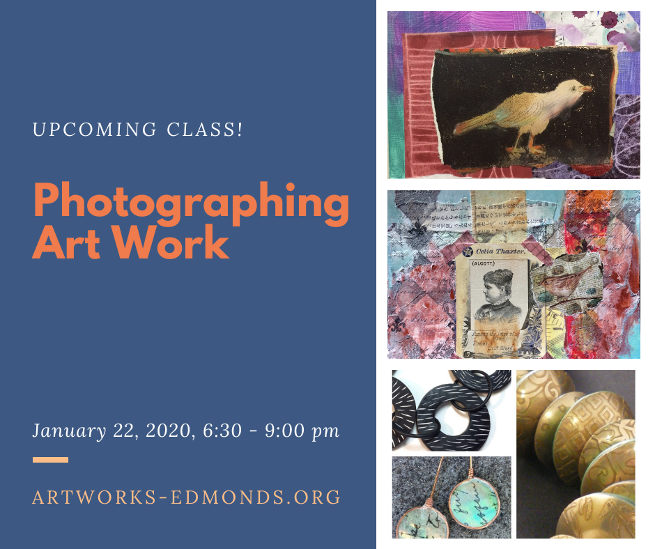 We have new classes designed to help artists gain new valuable skills!  Photographing Art Work: no camera?  No problem! Learn how to get great images just from your smart phone.  Simple tricks and tips will help you get the best results.  This course pairs with Marketing Made Easy for Artists, (Jan. 25, 1-4 pm) which will show you how to use your photos to create powerful PR pieces for your work.  More information is here: https://artworks-edmonds.org/classes/professional-development/